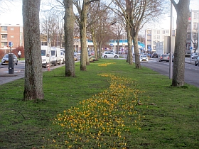 Vandaag voelde het buiten lenteachtig aan, de zon scheen een groot deel van de dag en de temperatuur liep op tot boven de 10 graden. Het was dan ook geen verrassing dat in de middenberm van de Slinge de krokussen al boven de grond komen (foto links).