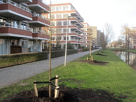 Op menige plek in de wijk zijn nieuwe bomen aangeplant, o.a. langs het noordelijke deel van de Burghsluissingel (foto links). De nieuwe bomen zijn te herkennen aan de drie steunpalen rondom de boom, vroeger waren deze palen rond maar nu zijn ze vierkant.