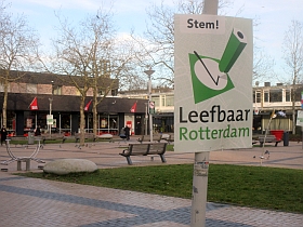 De verkiezingspropaganda is nu al begonnen: op Plein 1953 en langs de Slinge hangen sandwichborden van Leefbaar Rotterdam (foto rechts).