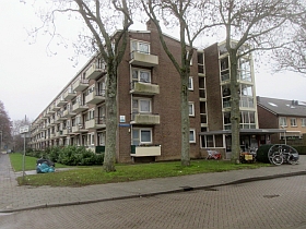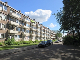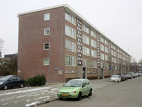 Ook in Pendrecht staan door Fiolet ontworpen huizen waaronder de flat aan de Middelharnisstraat 91A - 117D (foto links), opvallend zijn de vierkante metalen platen op de ramen van de trappenhuizen. Het in 1961 opgeleverde blok bestaat uit 56 woningen en is tot op de dag van vandaag in beheer van familievastgoedbedrijf De Groot, het is het enige complex dat zij in Pendrecht hebben. Als kind vond ik het al een deftige flat en die uitstraling heeft het gebouw nog steeds.