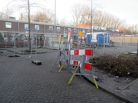 Een webloglezer tipte mij dat een deel van het Biezelingeplein tot 20 februari is afgesloten maar hij wist niet wat ze er gaan doen. Ik ging er vanmiddag een kijkje nemen en aan de westkant (tegenover huisnummer 9 waar vroeger dokter Davidsz woonde en werkte) is de parkeerplaats en een stukje straat afgezet met hoge hekken (foto), een rondje rijden kan dus tijdelijk niet. Er staan verkeersborden dat het ook voor voetgangers verboden gebied is, kennelijk is er in de grond iets aan de hand. Terwijl ik dit schrijf bedenk ik mij dat hier vlakbij enkele keren naar een mogelijke blindganger uit de tweede wereldoorlog is gezocht, dat was in 2010 op de hoek bij de Yersekestraat maar er werd toen niets gevonden. Update: de afsluiting is vanwege het vervangen van de daken van de twee huizenblokken aan het Biezelingeplein.