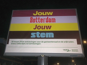 Anderhalve week na de verkiezingen staan er nog steeds sandwichborden van de politieke partijen om de lantaarnpalen. De affiches op het verkiezingsbord zijn vervangen door posters van de campagne Ik ben een Rotterdammer die aandacht schenkt aan de meer dan 170 verschillende nationaliteiten die in de stad wonen (foto rechts).